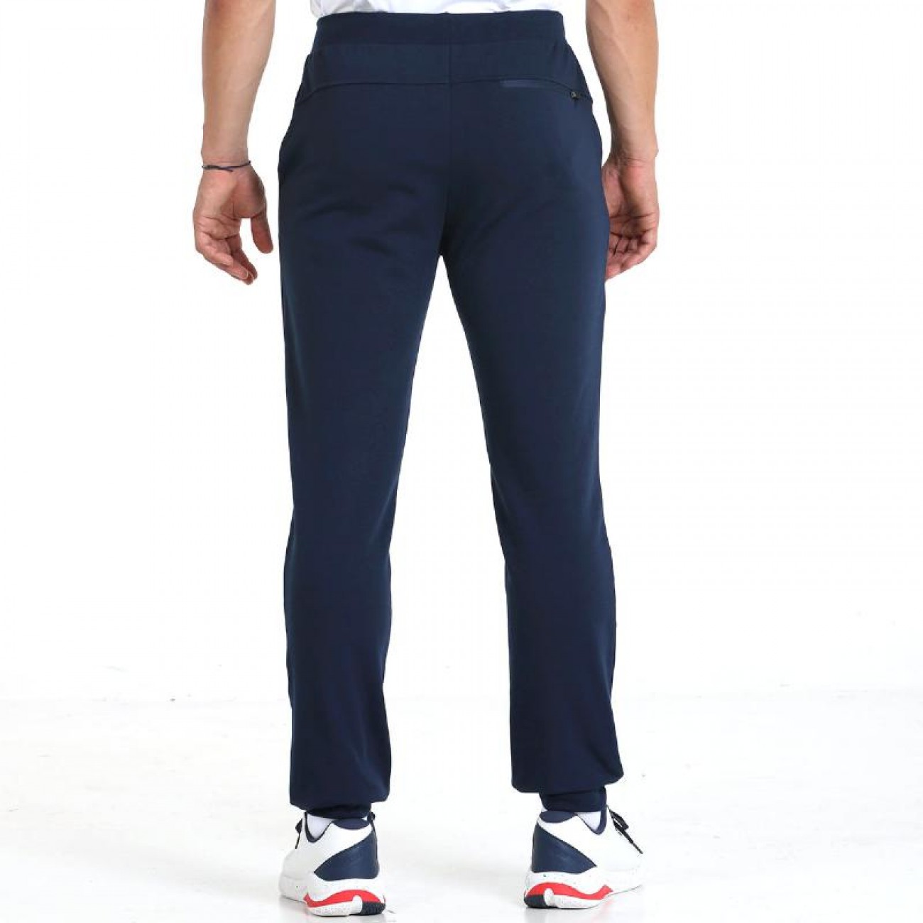 The design features an embroidered logo on one side, elastic ribbing on both the cuff and waistband, pockets on the sides and a zippered back pocket.