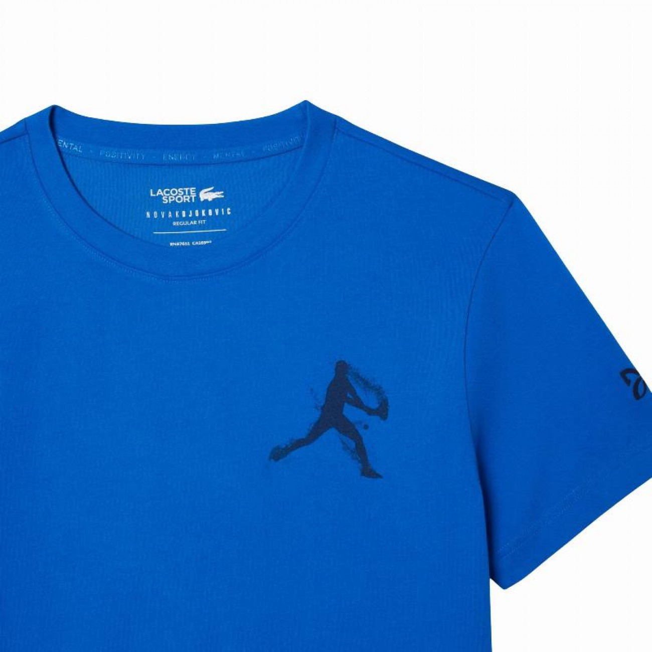 El diseño destaca por su estampado exclusivo de Novak Djokovic en acción en el pecho, junto al logotipo del jugador en la manga izquierda, y el clásico cocodrilo de silicona de Lacoste en la cintura.
