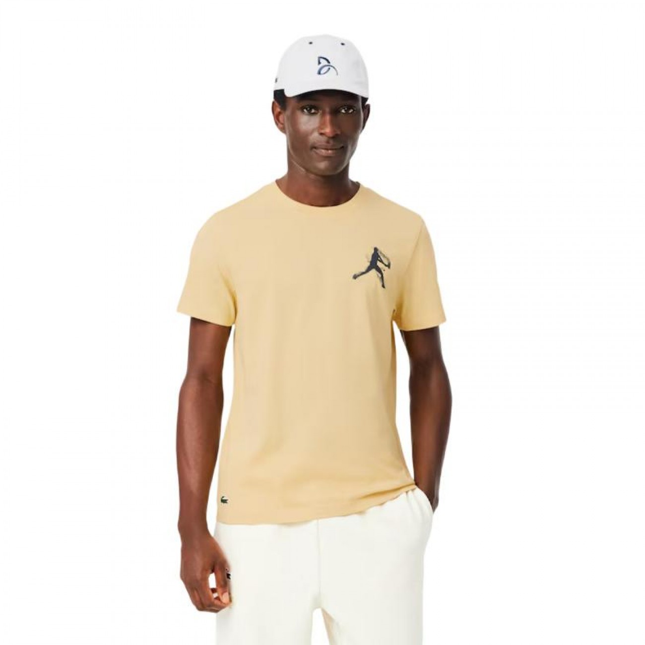 Cocodrilos de silicona en la camiseta y en la gorra, símbolo premium de Lacoste.
