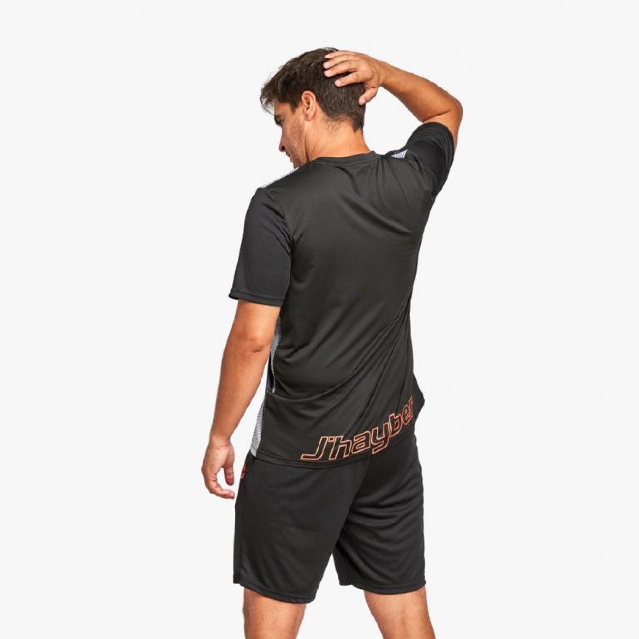 Camiseta deportiva para hombre en color negro, disenada con bandas, efecto desgastado y detalles en naranja, fabricada en tejido resistente y ligero.
